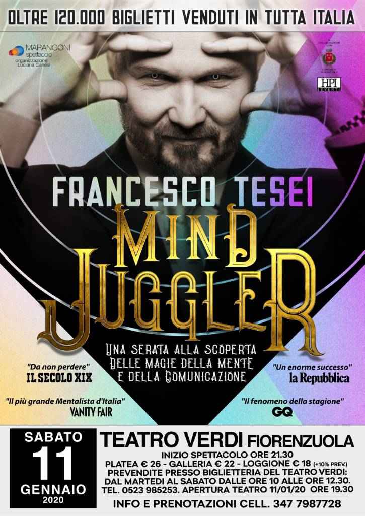 Radio Sound e Piacenza24 sono lieti di invitarvi allo spettacolo di Francesco Tesei, il più grande mentalista d’Italia, in programma sabato 11 gennaio al Teatro Verdi di Fiorenzuola.