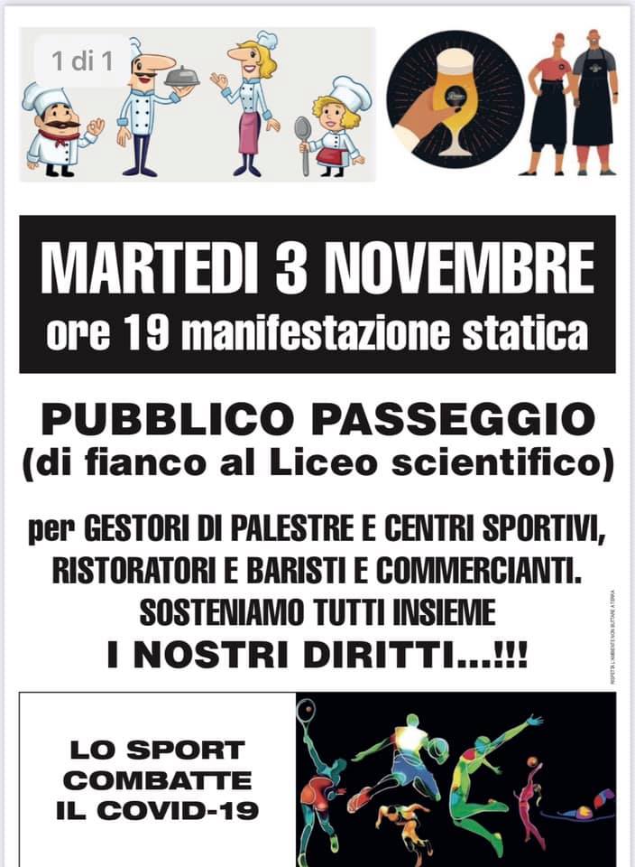 “Sosteniamo tutti insieme i nostri diritti”. Gli operatori economici tornano in piazza per protestare contro le chiusure imposte dal dpcm. In particolare i gestori di strutture sportive e i titolari di ristoranti e bar per i quali sono in vigore le norme più stringenti.