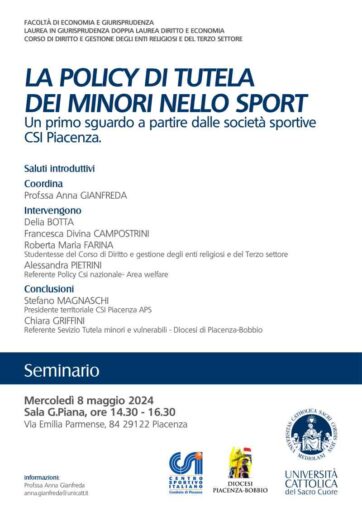 CSI Piacenza, la policy di tutela dei minori nello sport. Un primo sguardo a partire dalle società, è questo il titolo del seminario promosso nella sede dell’Università Cattolica del Sacro Cuore di Piacenza mercoledì 8 maggio dal Corso di diritto e gestione degli enti religiosi e del terzo settore – Facoltà di economia e giurisprudenza, dal Servizio diocesano tutela minori e adulti vulnerabili e dal Centro Sportivo Italiano-Comitato provinciale di Piacenza.
