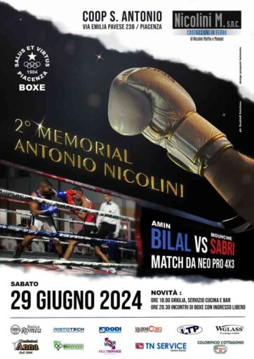 Memorial Antonio Nicolini, seconda edizione con la Salus et Virtus Boxe il 29 giugno. Dalle ore 20.30 alla Cooperativa Sant’Antonio è previsto un programma di 20 atleti , con 10 match di alto livello che animeranno la Cooperativa Sant’Antonio.