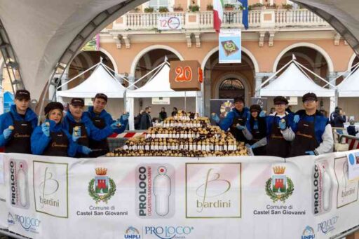 Oltre una ventina i mastri cioccolatai che hanno arricchito la manifestazione con le proprie dolcezze, accanto alle bancarelle di hobbisti, associazioni, commercianti (rappresentati anche dal Comitato Vita Centro Storico) e produttori locali. Ma il momento clou è stato come sempre il taglio del salame di cioccolato con Sergio Bertaccini, presidente della Pro Loco, insieme a Valentina Stragliati, primo cittadino di Castel San Giovanni, accompagnati dai sindaci e amministratori dei comuni limitrofi e dai presidenti Unpli Regionale e Provinciale. Oltre al salame dolce anche la piramide di profiteroles e la torta Rita per allietare i palati di tutti.