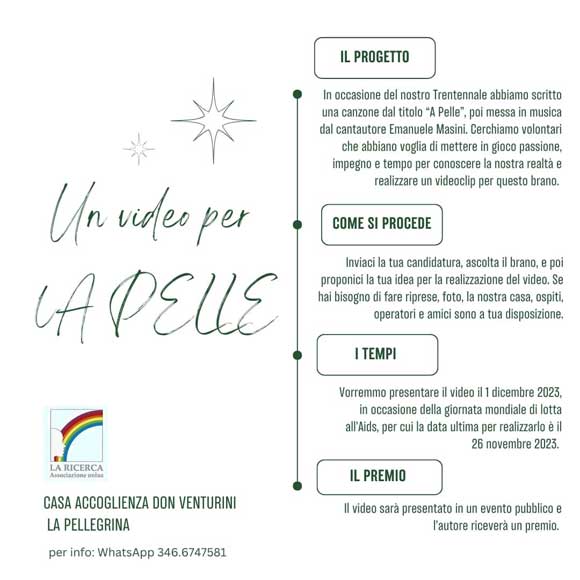 Chi volesse cimentarsi con un video sulle note di “A Pelle” ha tempo a presentarlo fino al 26 novembre. “Inviaci la tua candidatura, ascolta il brano, e poi proponici la tua idea per la realizzazione del video. Se hai bisogno di fare riprese, foto, la nostra casa, gli ospiti, operatori e amici, sono a tua disposizione. Per informazioni e partecipare invia un whatsapp al cell 346.6747581, numero che puoi anche chiamare direttamente”.