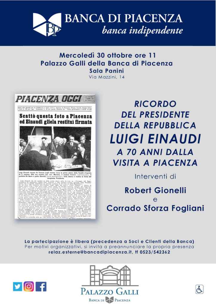 Ricordo del Presidente della Repubblica Luigi Einaudi, mercoledì 30 ottobre alle ore 11 a Palazzo Galli. L’appuntamento proposto dalla Banca di Piacenza è in programma alla Sala Panini.