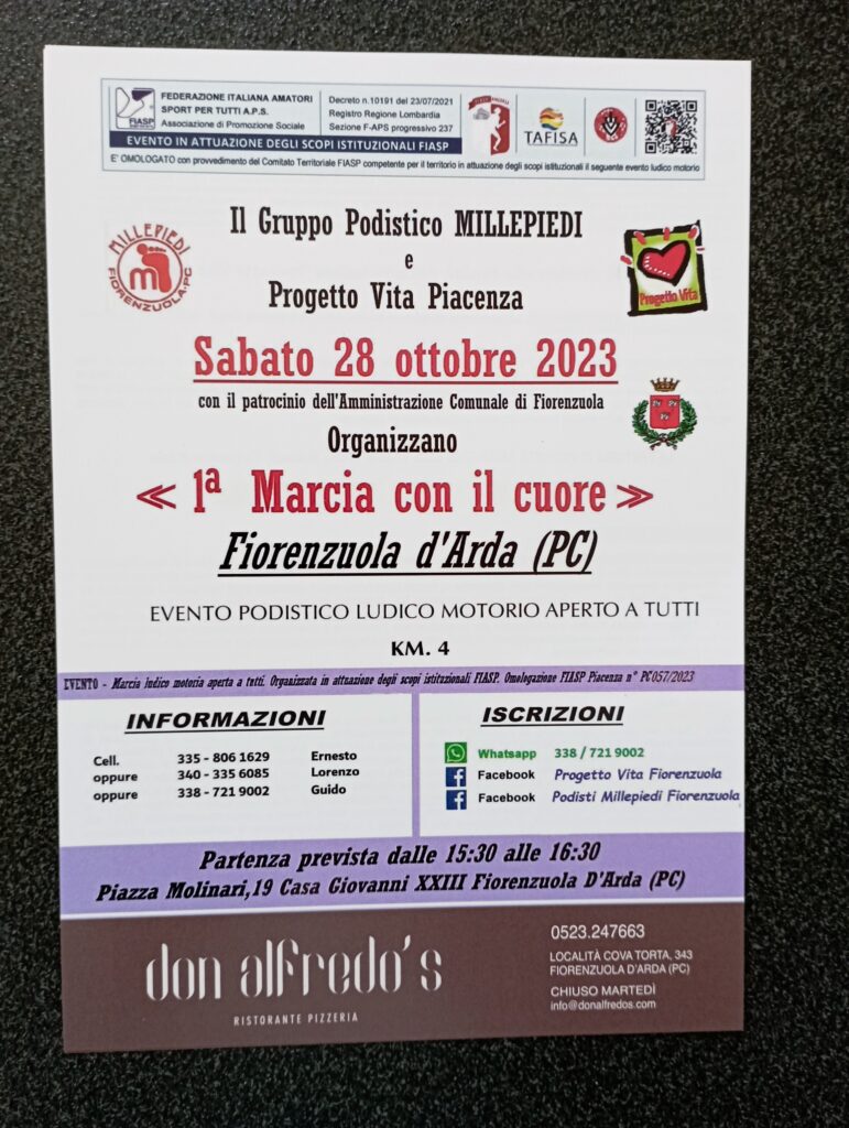 Il Gruppo Podistico “Millepiedi” e Progetto Vita con il patrocinio del Comune di Fiorenzuola d’Arda, organizzano la 1° Marcia del Cuore. Evento ludico motorio aperto a tutti su un percorso di 4 chilometri. La partenza è prevista dalle 15,30 alle 16,30 da Piazza Molinari 19 nei pressi della Casa Giovanni XXIII a Fiorenzuola d’Arda, all’arrivo ristoro per tutti i partecipanti.. Informazioni ed iscrizioni al 338 7219002 (Giuido) anche con messaggio Whatsapp oppure attraverso le pagine Facebook del Progetto Vita e Podisti Millepiedi.