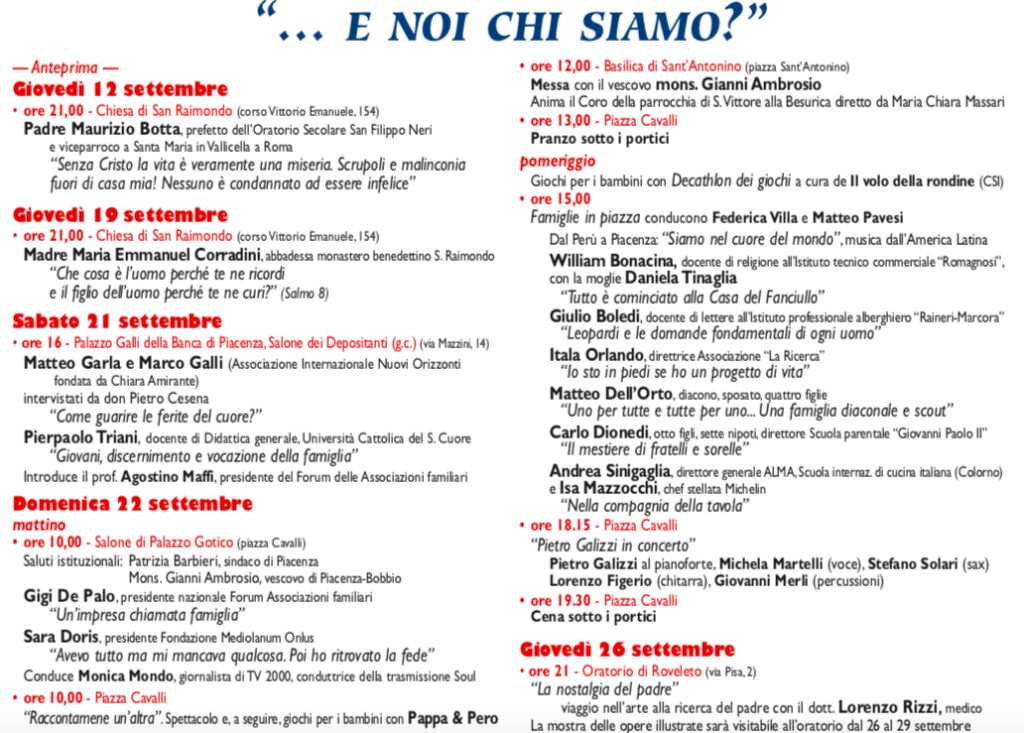 11^ edizione della Grande Festa della Famiglia, eventi fino al 26 settembre. L’iniziativa è promossa dal Forum delle Associazioni familiari, dal settimanale Il Nuovo Giornale, dalla Diocesi di Piacenza-Bobbio e dall’associazione Le Querce di Mamre.