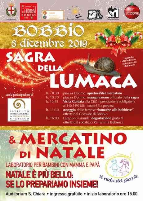 Domenica 8 Dicembre a Bobbio, il borgo dei borghi 2019, si svolgerà la 31° Sagra della Lumaca. Una manifestazione con le bancarelle del delizioso prodotto di elicicoltura e l’assaggio offerto dal Comune. Inoltre presenti i Mercatini di Natale, con oggetti natalizi, intrattenimenti per i bambini, nella suggestiva cornice del borgo antico di Bobbio.