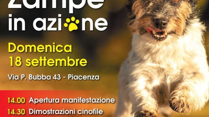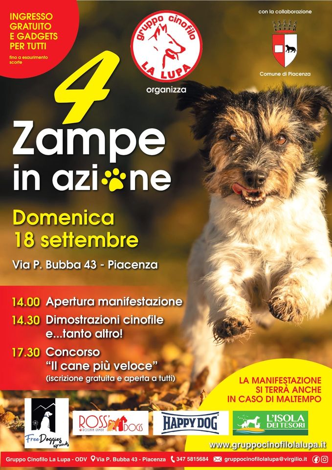4 Zampe in Azione, la 12^ edizione domenica 18 Settembre è in programma presso la nuova sede operativa del Gruppo Cinofilo La Lupa, in via Pietro Bubba, 43 a Piacenza.