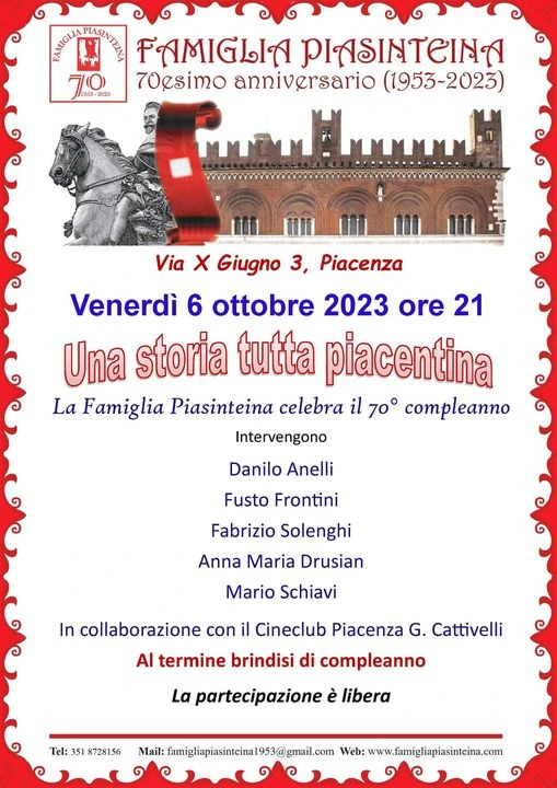 Il compleanno della Famiglia Piasinteina, Danilo Anelli: “70 anni di impegno nel difendere e diffondere la piacentinità”. Venerdì 6 ottobre alle ore 21, presso la sede in via X Giugno, si tiene “Una storia tutta piacentina – La Famiglia Piasinteina celebra i 70° compleanno”. La serata prevede la partecipazione di Danilo Anelli, Fausto Frontini, Fabrizio Solenghi, Anna Maria Drusian e Mario Schiavi. In collaborazione con il Cineclub Piacenza G. Cattivelli. La partecipazione è libera.