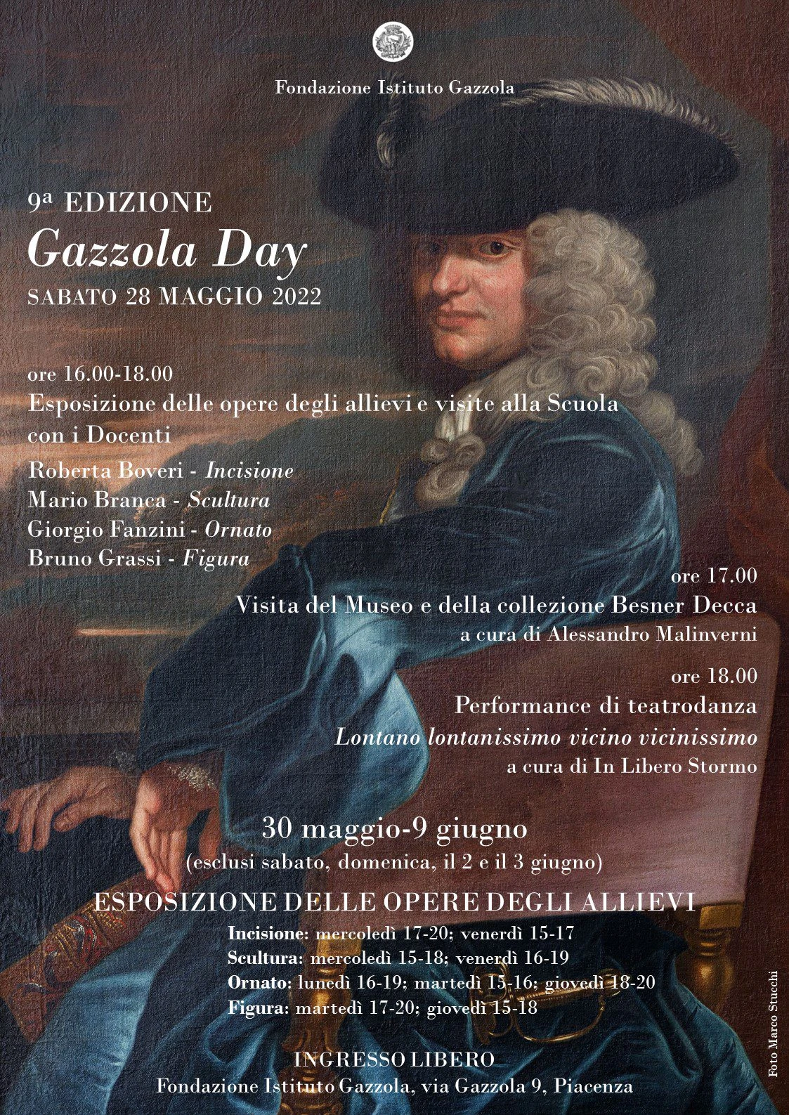 Il 28 maggio si terrà la nona edizione del Gazzola Day, la festa della scuola d’arte e del museo più antichi di Piacenza. Anche quest’anno sono previste visite alle aule dell’istituto con i maestri e gli allievi al lavoro. Nelle aule di scultura, ornato, figura e incisione, i visitatori saranno accolti dai docenti Roberta Boveri, Mario Branca, Giorgio Fanzini, Bruno Grassi.