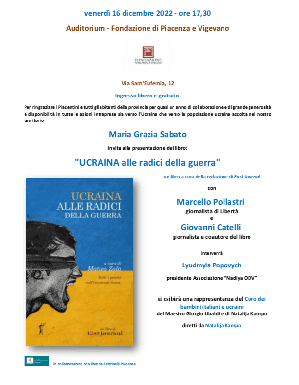 Venerdì 16 dicembre alle 17.30 presso l’Auditorium della Fondazione di Piacenza e Vigevano in via Sant’Eufemia, 12 è in programma la presentazione del libro “Ucraina alle radici della guerra”, in uscita proprio il 16 dicembre in tutte le librerie.