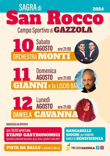 A Gazzola Sagra di San Rocco 2024 dal 10 al 12 agosto al campo sportivo. Ottimo cibo, tanta musica ma non solo: specialità piacentine, bancarelle, giochi per bimbi, banco di beneficenza.