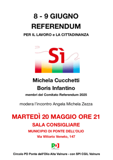 Martedì 20 maggio alle ore 21 in Municipio a Ponte dell’Olio è previsto un incontro sul referendum dell’8-9 giugno. Ospiti della serata organizzata dal Pd, Michela Cucchetti e Boris Infantino.