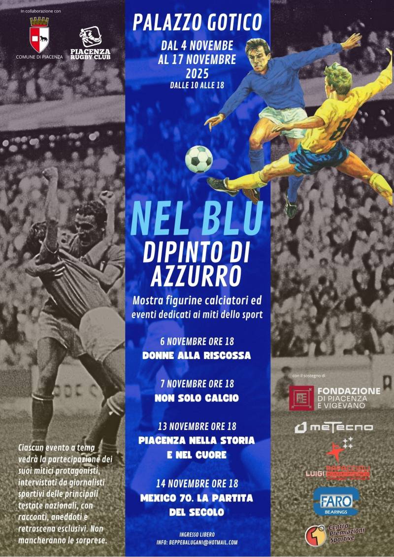 Presentata questa mattina la mostra “Nel blu dipinto d’azzurro” a cui hanno partecipato l’assessore allo Sport del Comune di Piacenza Mario Dadati, l’organizzatore Giuseppe Balugani, il consigliere dell’amministrazione della Fondazione di Piacenza e Vigevano Robert Gionelli, il direttore generale del Piacenza Calcio Francesco Fiorani, Claudio Forte per il Piacenza Rugby, Marino Bertoli sponsor della mostra, Fabrizio Poletti e Gianni Bellini.