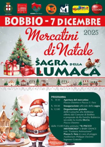 A Bobbio i Mercatini di Natale e la Sagra della Lumaca domenica 7 dicembre. Una giornata speciale che parte al mattino con i mercatini e tante idee regalo.