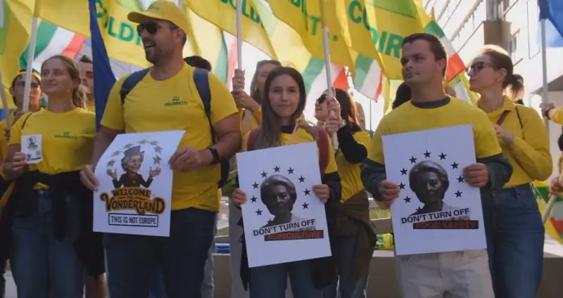 Dal palazzo Berlaymont, sede della Commissione Europea ai luoghi simbolo di Roma come il Colosseo, Fontana di Trevi e Piazza Navona, gli agricoltori hanno esposto striscioni raffiguranti Ursula Von der Leyen in una sorta di “Vonderland”, un territorio autoritario simbolo di un’Europa percepita come sempre più lontana dalla realtà, dai cittadini e dal mondo agricolo.