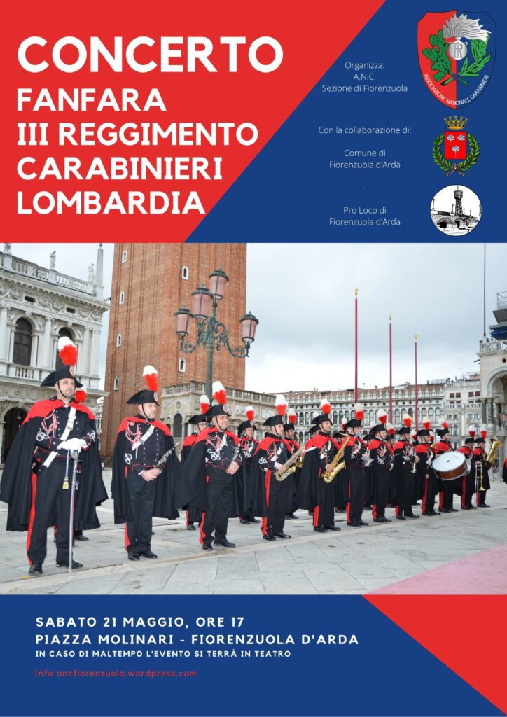 Straordinario evento in programma a Fiorenzuola dove Piazza Molinari ospiterà il concerto della Fanfara del III Reggimento Carabinieri Lombardia. Appuntamento sabato 21 maggio alle 17. Un evento organizzato da Associazione Nazionale Carabinieri – Sezione di Fiorenzuola, con la collaborazione del Comune di Fiorenzuola e della Pro Loco di Fiorenzuola.