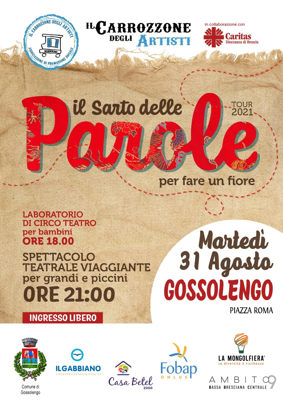 Il 31 agosto Gossolengo ospiterà in piazza Roma lo spettacolo teatrale “Il sarto delle parole” della compagnia “Il carrozzone degli artisti “ che si svilupperà in due momenti: alle ore 18,00 ci sarà un laboratorio per i bambini mentre alle ore 21.00 gli artisti si esibiranno per un pubblico più vasto.