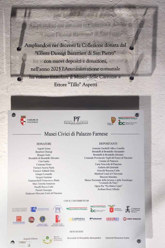 Nella cornice della Sezione delle Carrozze a Palazzo Farnese, ha avuto luogo lo scoprimento ufficiale della targa in memoria del restauratore Ettore Aspetti, la cui opera preziosa e competente fu determinante per il recupero di un patrimonio storico che oggi costituisce il nucleo di una collezione museale tra le più importanti in Italia.