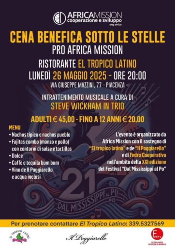 A Piacenza cena sotto le stelle per l’Uganda il 26 maggio. Lunedì alle 20 al ristorante messicano El Tropico Latino di Piacenza si tiene infatti la cena benefica pro-Africa Mission con il concerto blues di Steve Wickham accompagnato alla chitarra e alla voce da Ray Coen. La serata è organizzata anche con il sostegno dell’azienda ”Il Poggiarello”, oltre che del ristorante e di Fedro Cooperativa nell’ambito della 21esima edizione del festival ”Dal Mississippi al Po”.