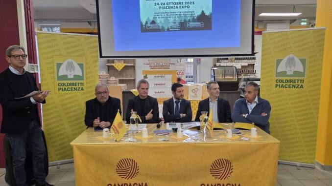Forestalia, con il corollario di Tecnovitis, Bosco in Tavola e il Mercato del Miele, è stata presentata oggi in conferenza stampa al Mercato di Campagna Amica dal Direttore di Coldiretti Piacenza, Roberto Gallizioli, dal Presidente e dal Direttore di Piacenza Expo, Giuseppe Cavalli e Sergio Copelli, dal Presidente del Centro di formazione “Vittorio Tadini”, Paolo Sckokai, e da Giancarlo Spezia, Presidente del Gruppo Spezia-Tecnovit.