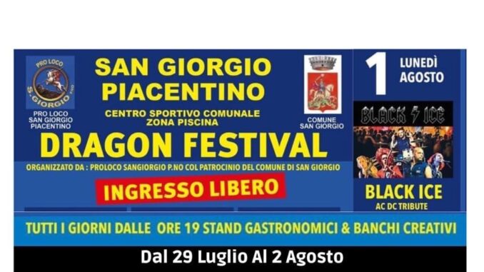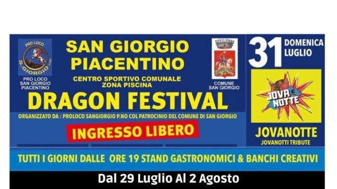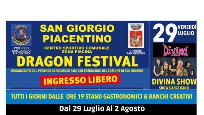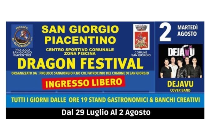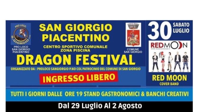 A San Giorgio Piacentino, Dragon Festival dal 29 luglio al 2 agosto. La Pro Loco locale con il patrocinio del Comune propongono la serie di serate con Stand gastronomici, banchi creativi, musica e all’insegna del grande divertimento.