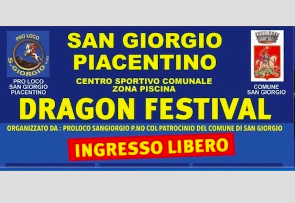 A San Giorgio Piacentino, Dragon Festival dal 29 luglio al 2 agosto. La Pro Loco locale con il patrocinio del Comune propongono la serie di serate con Stand gastronomici, banchi creativi, musica e all’insegna del grande divertimento.