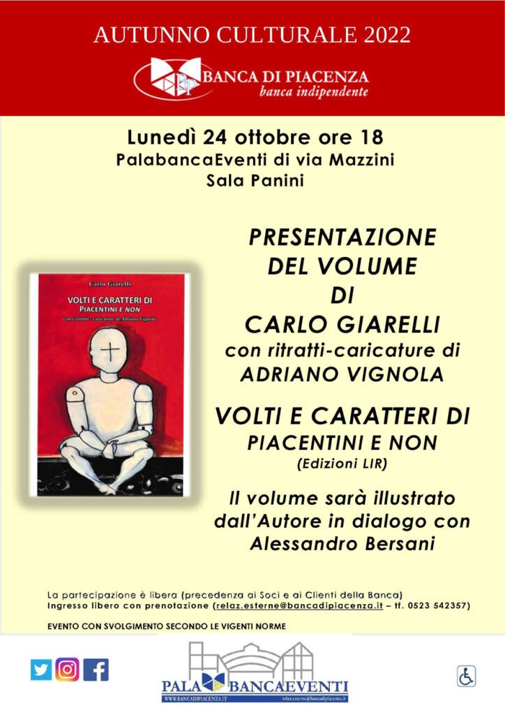 Lunedì 24 ottobre, alle 18, nuovo appuntamento con l’Autunno culturale della Banca di Piacenza. Al PalabancaEventi di via Mazzini, Sala Panini, presentazione del volume “Volti e caratteri di Piacenza e non” di Carlo Giarelli, con ritratti-caricature di Adriano Vignola (Edizioni Lir).
