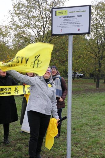 Nella cornice del Parco Montecucco si è celebrata l’inaugurazione della panchina gialla e la piantumazione dell’albero per i diritti umani – un esemplare di Gingko Biloba – per celebrare il 60esimo anniversario della fondazione del gruppo piacentino di Amnesty International. Un’ iniziativa dal forte valore simbolico in collaborazione con l’Amministrazione comunale e l’associazione Cosmonauti. Nell’occasione, accanto ai rappresentanti di tutte coinvolte, sono intervenuti con propri elaborati le studentesse e gli studenti di sei classi della scuola secondaria di I grado Italo Calvino e le loro insegnanti, facendo seguito al progetto “Facciamo crescere i diritti”.