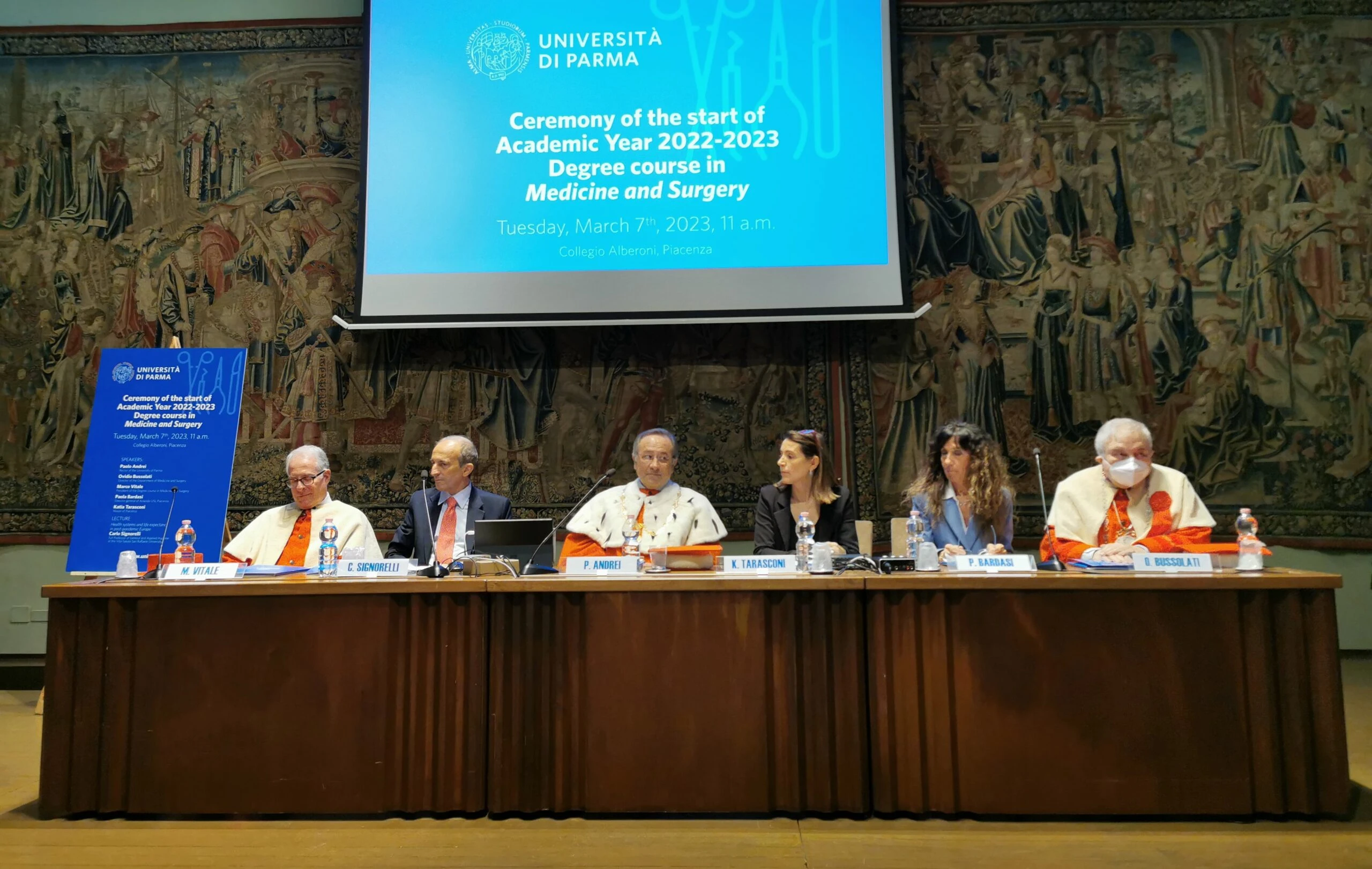 «Per me si tratta dell’ultimo inizio di anno accademico da Rettore dell’Università di Pama, e devo confessare che essere qui è insieme una grande emozione e un grande orgoglio. Sono molto fiero che, con un ottimo lavoro di squadra, si sia arrivati all’attivazione di questo corso: un progetto strutturato sulle riconosciute qualità del sistema universitario e del sistema sanitario dell’Emilia-Romagna e che sa guardare con lungimiranza al futuro», ha spiegato il Rettore, che dopo un riferimento di contesto ai «tempi difficili che stiamo vivendo» (tra pandemia e guerre) ha sottolineato i punti di forza del corso (dalla qualità dell’iter formativo alla dimensione internazionale e alla possibilità di avvalersi in esclusiva del sistema ospedaliero di Piacenza) e ringraziato i partner «che con noi ci hanno creduto fin da subito comprendendone l’importanza strategica come motore di sviluppo e competitività per tutto il territorio».