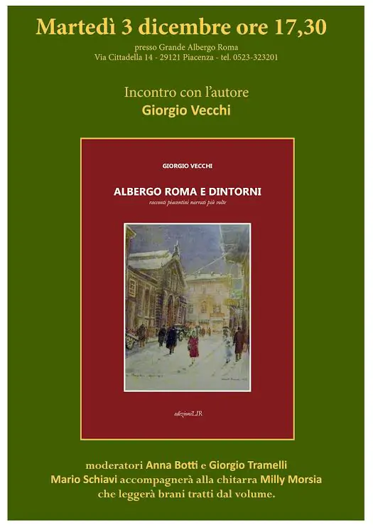 Martedì 3 dicembre 2024 alle ore 17,30 presso il Grande Albergo Roma in via Cittadella 14 a Piacenza si terrà un incontro con l’autore e scrittore Giorgio Vecchi che parlerà del proprio libro “Albergo Roma e dintorni – Racconti piacentini narrati più volte” (Edizioni LIR).