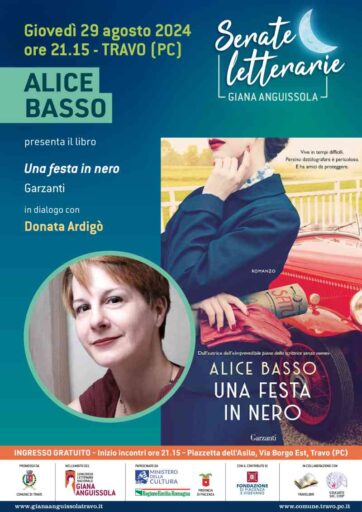 Alice Basso ospite all’ultimo appuntamento delle Serate letterarie Giana Anguissola a Travo, giovedì 29 agosto alle ore 21,15, presenterà il quinto ed ultimo capitolo della sua opera: ”Una festa in nero”. L’autrice sarà in piazzetta dell’asilo, in via Borgo Est in dialogo con Donata Ardigò.