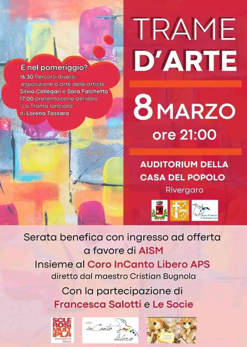 Coro inCanto libero, con la partecipazione di Francesca Salotti e Le socie. La serata ha come obiettivo finale anche la raccolta fondi: l’ingresso sarà con ingresso ad offerta, ed il ricavato sarà devoluto all’Associazione Italiana Sclerosi Multipla.