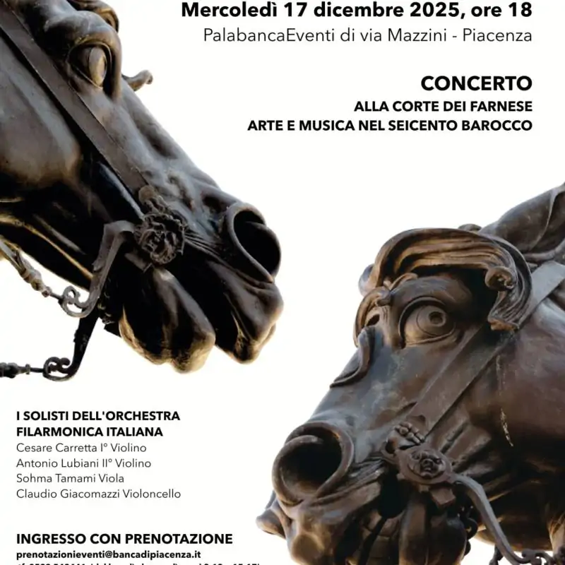 “Alla corte dei Farnese: arte e musica nel Seicento barocco”, questo il tema del concerto, a cura degli Amici della lirica, che si terrà mercoledì 17 dicembre, alle 18, al PalabancaEventi di via Mazzini, evento collaterale alla mostra “Piacenza e i suoi cavalli”, a cura della Banca di Piacenza e che si inserisce quindi nelle celebrazioni per i 400 anni dei Cavalli del Mochi, simbolo identitario della città e capolavoro assoluto dell’arte italiana del primo Seicento.