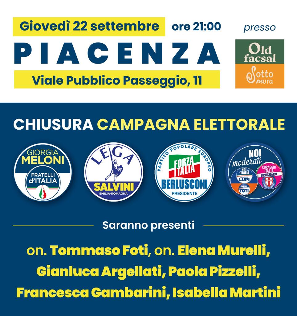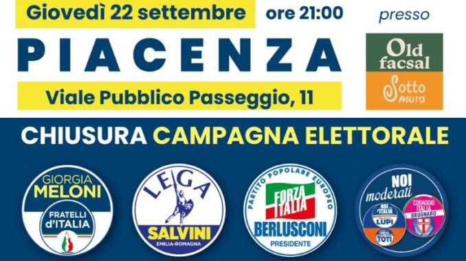 Le forze politiche di Centrodestra, nell’ambito della campagna elettorale per le elezioni politiche del 25 settembre 2022, concluderanno la serie di incontri avviata con i cittadini facendo tappa, questa volta, a Piacenza.