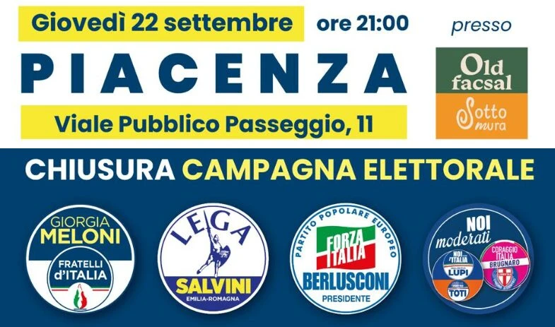Le forze politiche di Centrodestra, nell’ambito della campagna elettorale per le elezioni politiche del 25 settembre 2022, concluderanno la serie di incontri avviata con i cittadini facendo tappa, questa volta, a Piacenza.