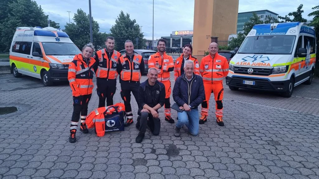 Si allega foto dei due equipaggi sanitari partiti con i due Coordinatori di Protezione Civile Anpas della Provincia di Piacenza Giorgio Villa e Oreste Guglielmetti.
