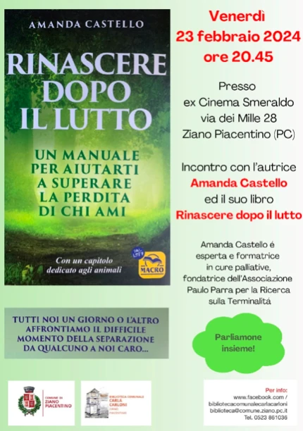 “Rinascere dopo il lutto – Un manuale per aiutarti a superare la perdita di chi ami”. Il libro di Amanda Castello sarà presentato venerdì 23 febbraio alle ore 20.45 all’ex Cinema Smeraldo a Ziano Piacentino. In occasione della presentazione, saranno disponibili le copie del libro a offerta libera.