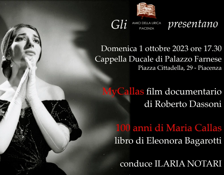Riprendono, dopo la pausa estiva, il 1 ottobre alle ore 17 30 presso la Cappella Ducale a Palazzo Farnese, gli appuntamenti musicali e gli approfondimenti degli AMICI DELLA LIRICA. Per celebrare i 100 anni dalla nascita della “Divina” verrà proiettato il docufilm “MYCALLAS”, con la regia di ROBERTO DASSONI, aiuto regia AUGUSTA GRECCHI e la colonna sonora di GIAN FRANCESCO AMOROSO, che prende spunto dal libro di ELEONORA BAGAROTTI “100 anni di Maria Callas nei ricordi di chi l’ha conosciuta”. Gli autori saranno in conversazione con ILARIA NOTARI.