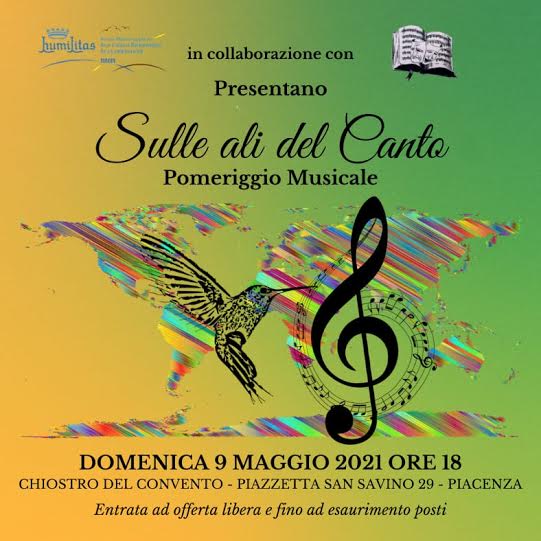 Da queste profonde e quanto mai vere parole del Beato Giovanni Battista Scalabrini, vescovo diPiacenza, le Suore Missionarie di San Carlo Borromeo Scalabriniane e l’Associazione Amici dellaLirica di Piacenza, hanno colto lo spunto per organizzare un pomeriggio musicale, domenica 9 maggio 2021 alle ore 18, presso il Chiostro del Convento stesso, intitolatoSulle ali del Canto.