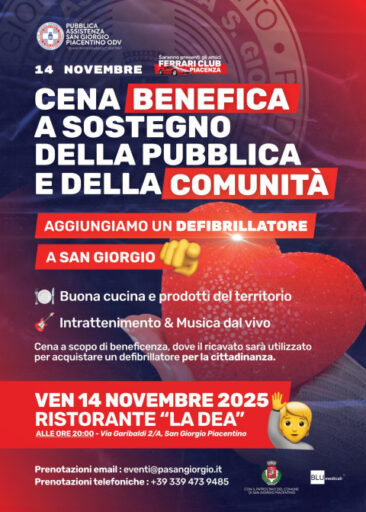 La Pubblica Assistenza San Giorgio organizza per il 14 novembre una Cena Benefica al ristorante “La Dea” per raccogliere fondi per acquistare un DAE da destinare alla cittadinanza.