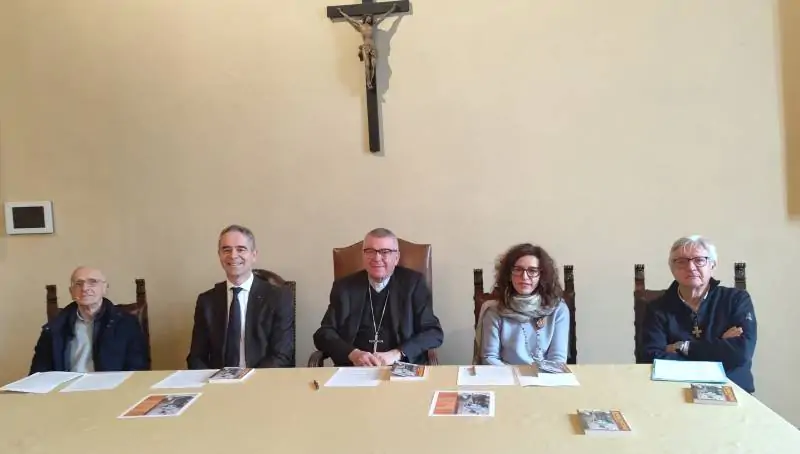 il vescovo mons. Adriano Cevolotto, il cancelliere vescovile don Mario Poggi, che ha offerta una panoramica dei dati della pubblicazione, Pietro Boselli, vice direttore generale della Banca di Piacenza; la giornalista Barbara Sartori e Pietro Scottini, direttore degli Archivi diocesani.