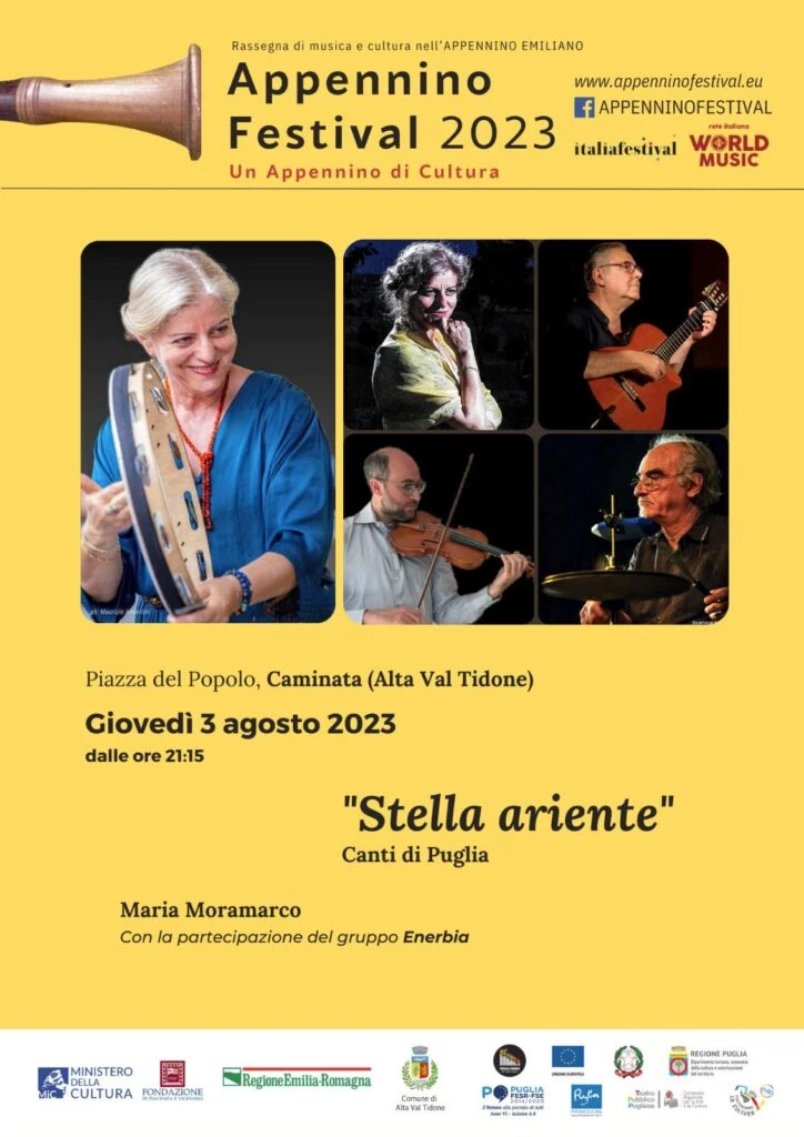 Il 3 agosto in Piazza del Popolo a Caminata (Alta Val Tidone), alle 21.15, tocca a Maria Moramarco con “Stella Ariente”: da sempre impegnata nel lavoro di recupero e la riproposizione della musica di tradizione orale, Moramarco si fa interprete di un repertorio meno noto dell’Alta Murgia barese, proponendo un viaggio suggestivo attraverso il canto religioso dialettale.