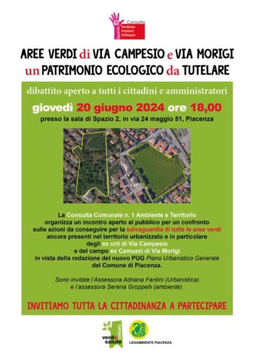 Aree verdi di via Campesio e via Morigi, Legambiente Piacenza: “Patrimonio da tutelare, no a palazzine e supermercati”. In vista della redazione del PUG, Piano Urbanistico Generale, del Comune di Piacenza giovedì 20 giugno 2024 è in programma un dibattito pubblico allo Spazio 2 (via 24 Maggio) organizzato dalla Consulta Comunale n.1 Ambiente eTerritorio.