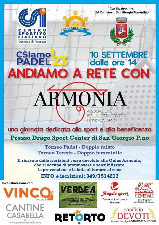 “Domenica è una bellissima giornata all’insegna dello sport nello specifico si disputano incontri di tennis e padle – anticipa la Presidente di Armonia Romina Cattivelli – un’iniziativa di tipo sportivo proposta dal CSi Centro Sportivo Italiano comitatodi Piacenza, a San Giorgio Piacentino. Sarà un torneo benefico i cui proventi sono delvoluti ad Armonia e alla ricerca”.