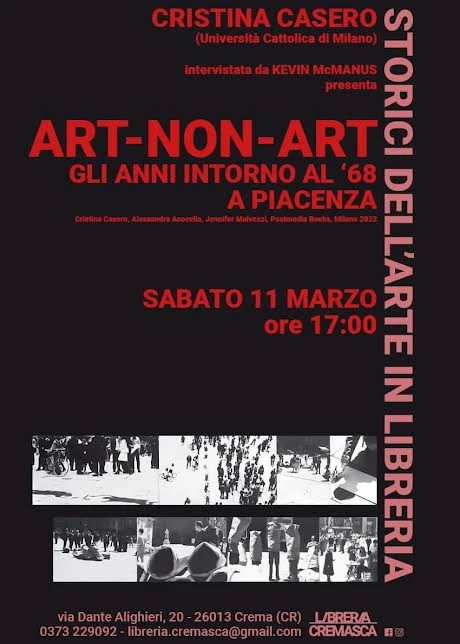 Sabato 11 marzo alle ore 17 alla “Libreria Cremasca” in via Dante Alighieri 20 a Crema sarà presentato il libro “Art non.Art Gli anni intorno al ’68 a Piacenza “ di Cristina Casero, Alessandra Acocella e Jennifer Malvezzi edito e distribuito a livello nazionale da Postmedia Book di Milano con il sosegno della Fondazione di Piacenza e Vigevano.