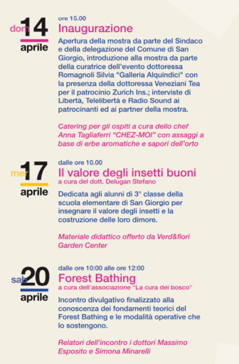 L’inaugurazione è in programma il 14 aprile alle ore 15. L’apertura della mostra vedrà la presenza del Sindaco e della delegazione del Comune di San Giorgio, mentre l’introduzione sarà affidata alla curatrice alla dottoressa Silvia Romagnoli della Galleria Alquindici.