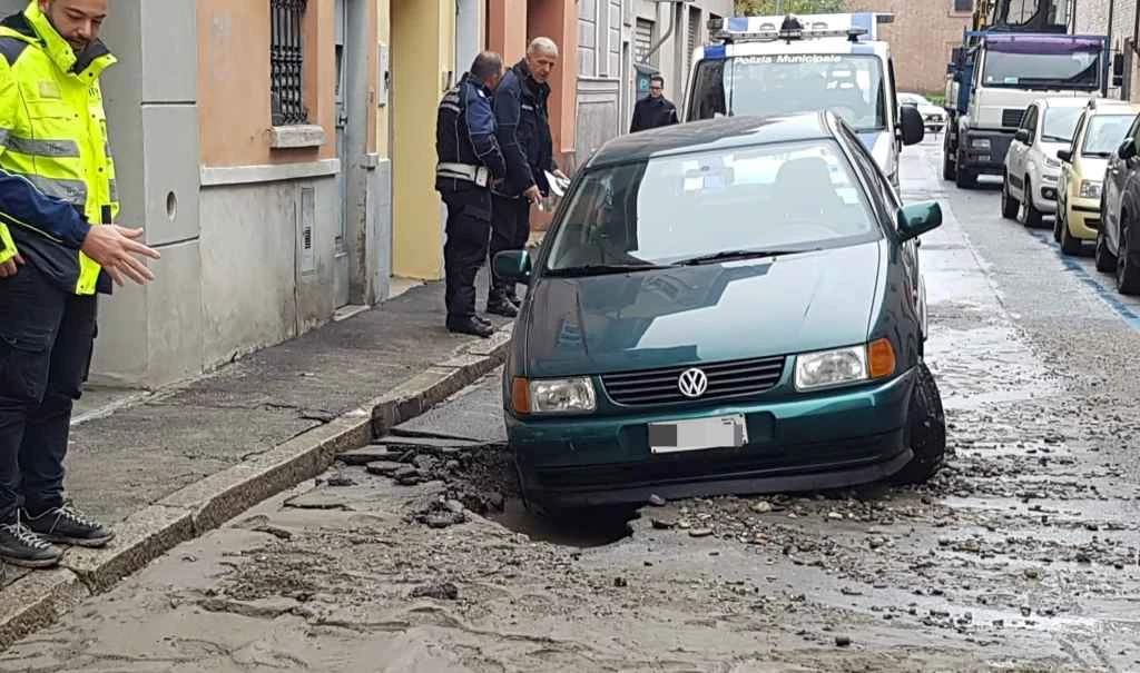 Asfalto cede per il maltempo in via San Bartolomeo, tecnici Iren al lavoro. Le forti piogge degli ultimi giorni stanno causando problemi anche nel centro di Piacenza dove si è aperta una voragine nell’area di Porta Borghetto. Sul posto presente anche la Polizia Municipale di Piacenza.
