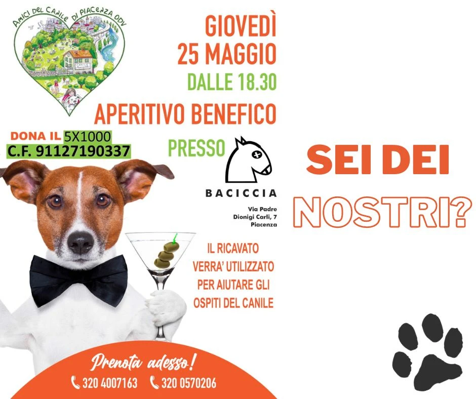 Associazione Amici del Canile di Piacenza promuove con il sostegno di Baciccia un aperitivo benefico per sostenere le attivita del Canile comunale di Piacenza Giovedi 25 maggio a partire dalle ore 18,30.