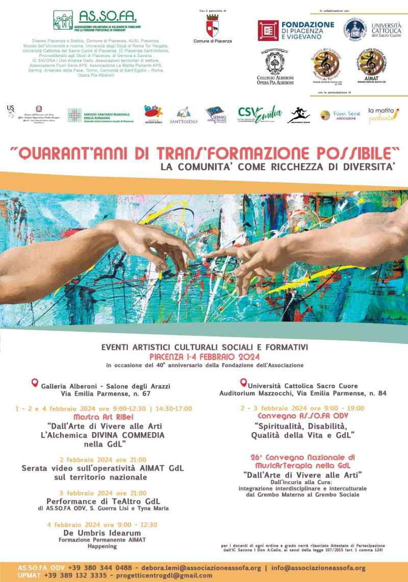 AS.SO.FA. ODV, nata nel 1981 per volere di Mons. Manfredi Vescovo di Piacenza, in questi 40 anni di vita, ha coltivato, creduto e sperimentato la Spiritualità nelle persone con disabilità, in quanto ritenuta una dimensione fondamentale della Persona umana, attraverso il “Percorso del Trascendente vissuto col corpo”, la catechesi e la preparazione ai Sacramenti, l’Animazione della liturgia con gestualità e più linguaggi. In questi anni ci siamo confrontati con esperienze importanti che ci hanno aiutato ed accompagnato nella crescita di questo cammino umano e spirituale travolgente; citiamo le tre più importanti Fede e Luce, l’Arca di Jean Venier e la Comunità di Sant’Egidio.