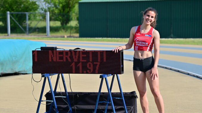 Anche Eleonora Nervetti, allieva di Giovanni Baldini, ha mancato di pochissimo il pass europeo, nel suo caso nella gara dei 100m: per la prima volta, Eleonora è scesa sotto il muro dei 12 secondi, vincendo la gara in 11”97, a soli sette centesimi dallo standard di partecipazione. Eleonora ha anche notevolmente migliorato il proprio limite anche sui 200m, corsi in 24”58. A poca distanza, la compagna di squadra Rebecca Cravedi giungeva seconda con il record personale di 24”90. Rebecca ha poi centrato la medaglia d’argento nella gara spuria dei 300hs, portati a termine in 45”55. Sofia Porcari ha invece vinto la medaglia di bronzo nella stessa gara in 46”77.